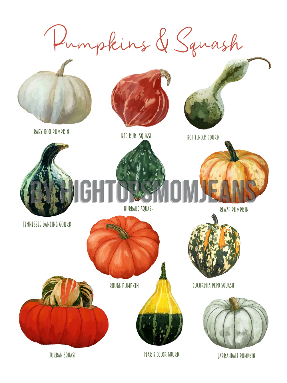 Enjoy the brilliant colors of fall in this pretty botanical print. Each lovely, illustrated pumpkin or squash is labeled with its common name. This print includes the following varieties: Baby Boo, Red Kuri Squash, Bottleneck Gourd, Tennessee Dancing Gourd, Rouge Pumpkin, Hubbard Squash, Blaze Pumpkin, Pepo Squash, Turban Squash, Pear Bicolor Gourd, Jarrahdale Pumpkin.
